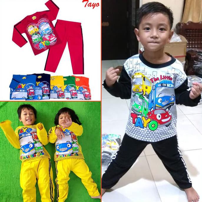 Setelan tidur celana panjang. Setelan kaos anak tayo kaos karakter dengan kain bahan 100 katun dengan jenis katun combed 20 s yang cocok untuk digunakan anak anak sehari hari. Sebaiknya baju tidur anak tidak dilengkapi dengan aksesoris lain selain gambar atau kancing baju.