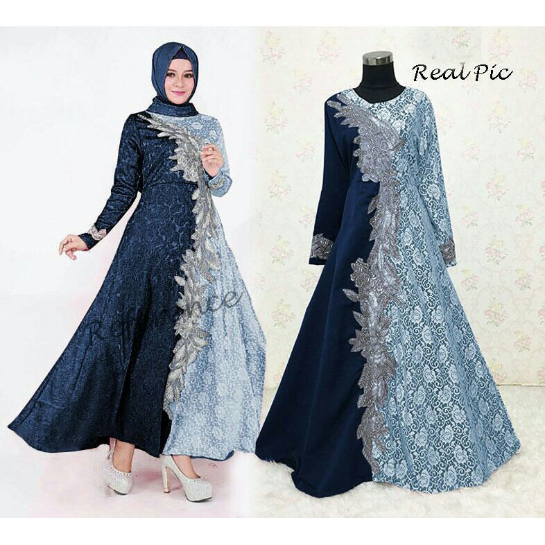 Am34 Baju Gamis Pesta Gamis Brokat Brukat Kombinasi Polos Muslim Jumbo Xl Riska Warna Navy