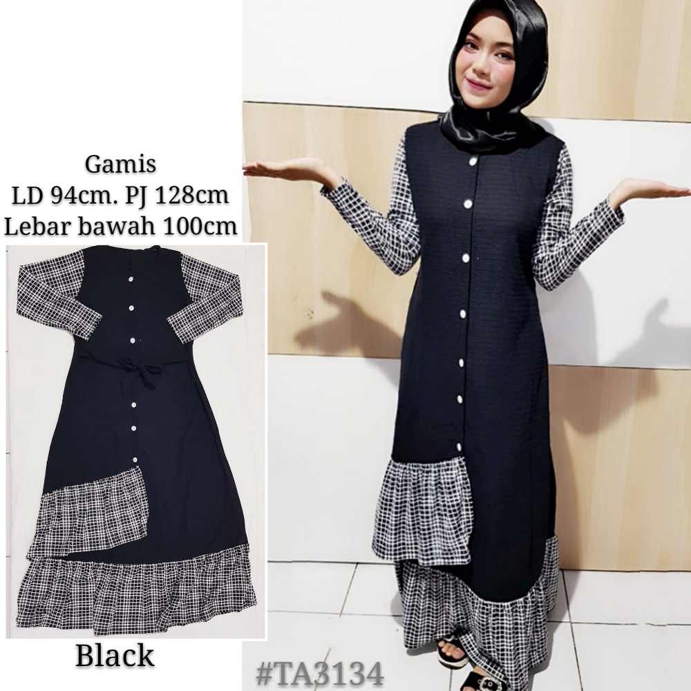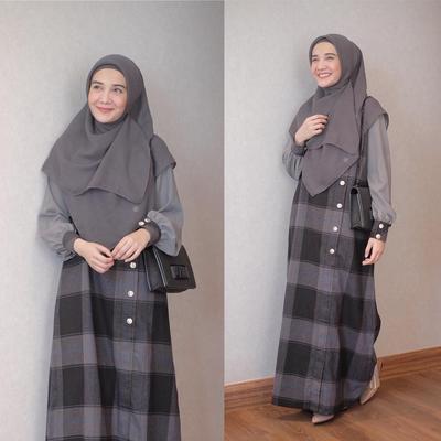 Gamis Abu Abu Grey Hitam Black Kobinasi Kotak Kotak Hitam Putih Long